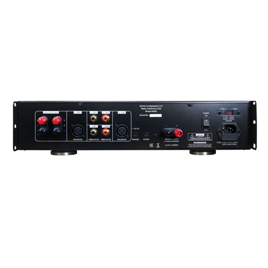 On the rear, inputs include left/right high-level binding posts for use with speaker output signals, left/right RCA and Left/right balanced XLR's. A pair of left/right RCA outputs provide buffered zero gain signals to feed other amplifiers - useful for connecting multiple M1000's in home theater applications or an additional 70V stereo amplifier in 70V landscape applications.