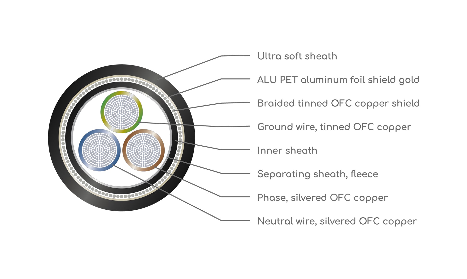 Fully shielded power cables are crucial for high quality audio and video systems. VIABLUE™ power cables block any distortion and thus provide crystal clear and high-purity signals. Braided and aluminum foil shields surround 3 cores with silver plated OFC copper strands and thus block interference 100%.
