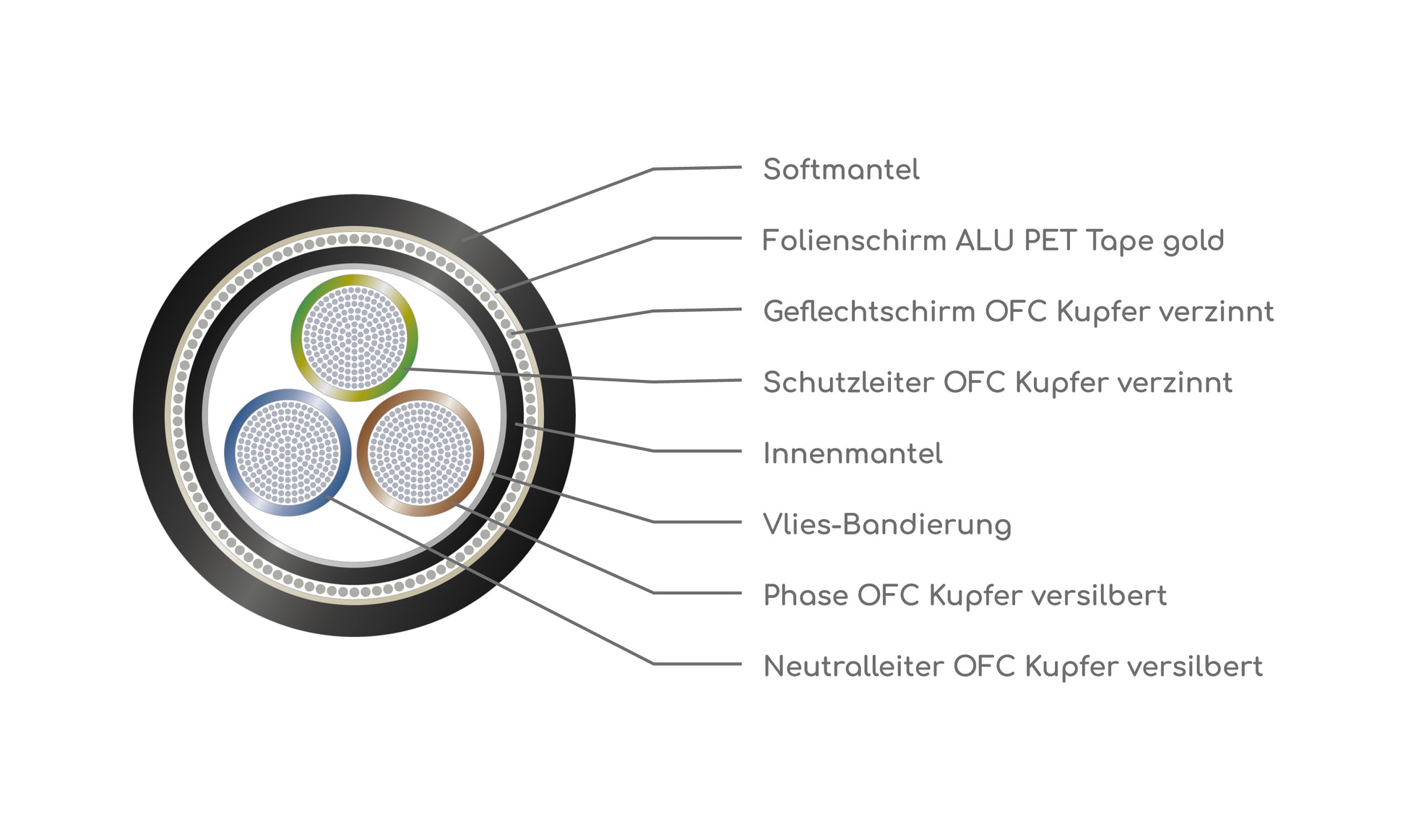 - Silver-plated OFC copper strands (brown, blue)
